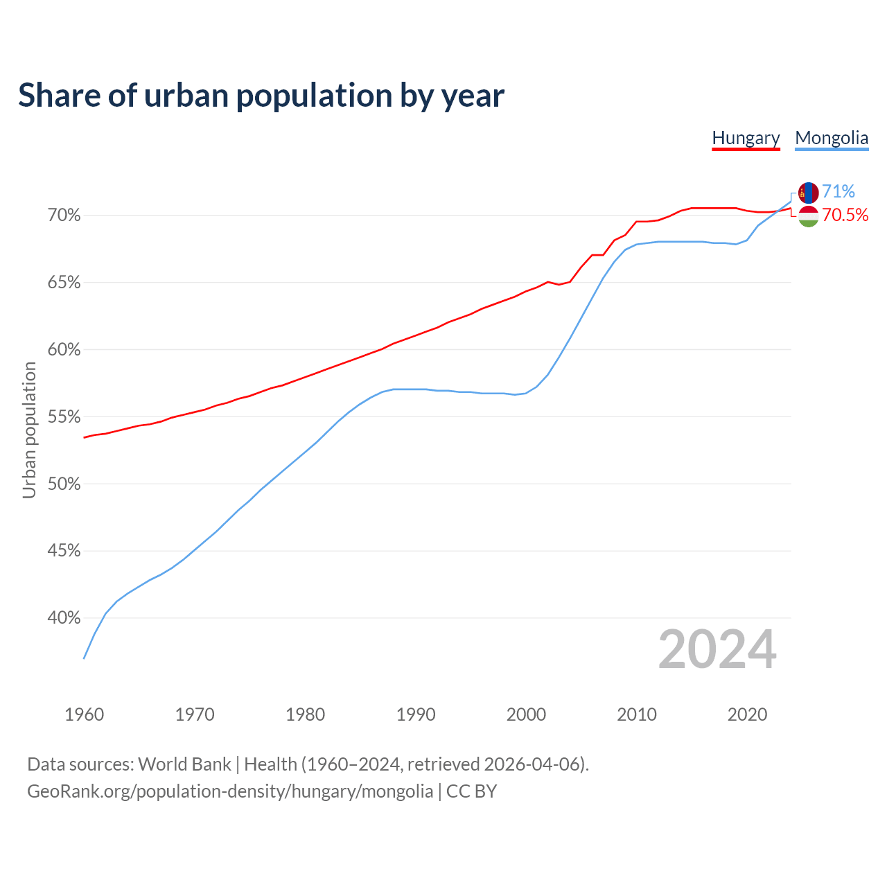 From 2004 to 2024, the share of urban population changed from 65% to 70.5% in Hungary and from 60.8% to 71% in Mongolia.