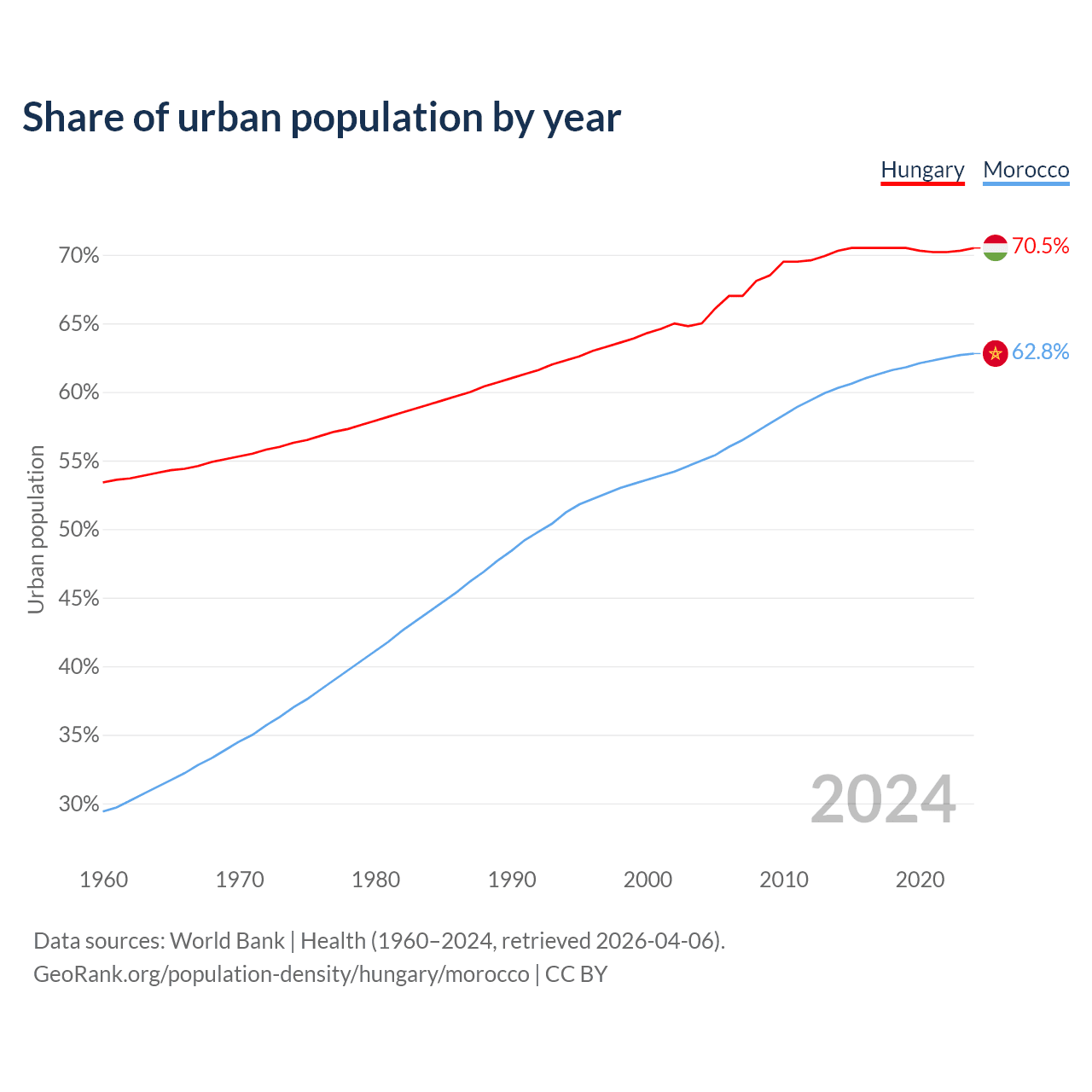 From 2004 to 2024, the share of urban population changed from 65% to 70.5% in Hungary and from 55% to 62.8% in Morocco.
