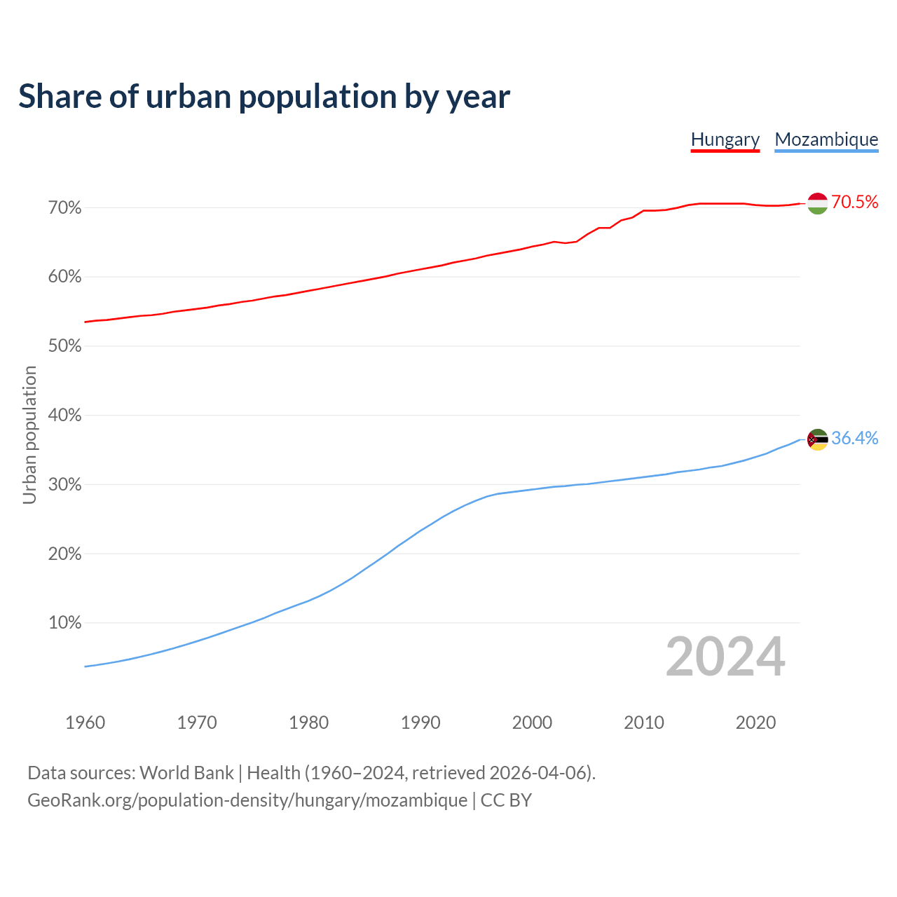 From 2004 to 2024, the share of urban population changed from 65% to 70.5% in Hungary and from 29.9% to 36.4% in Mozambique.