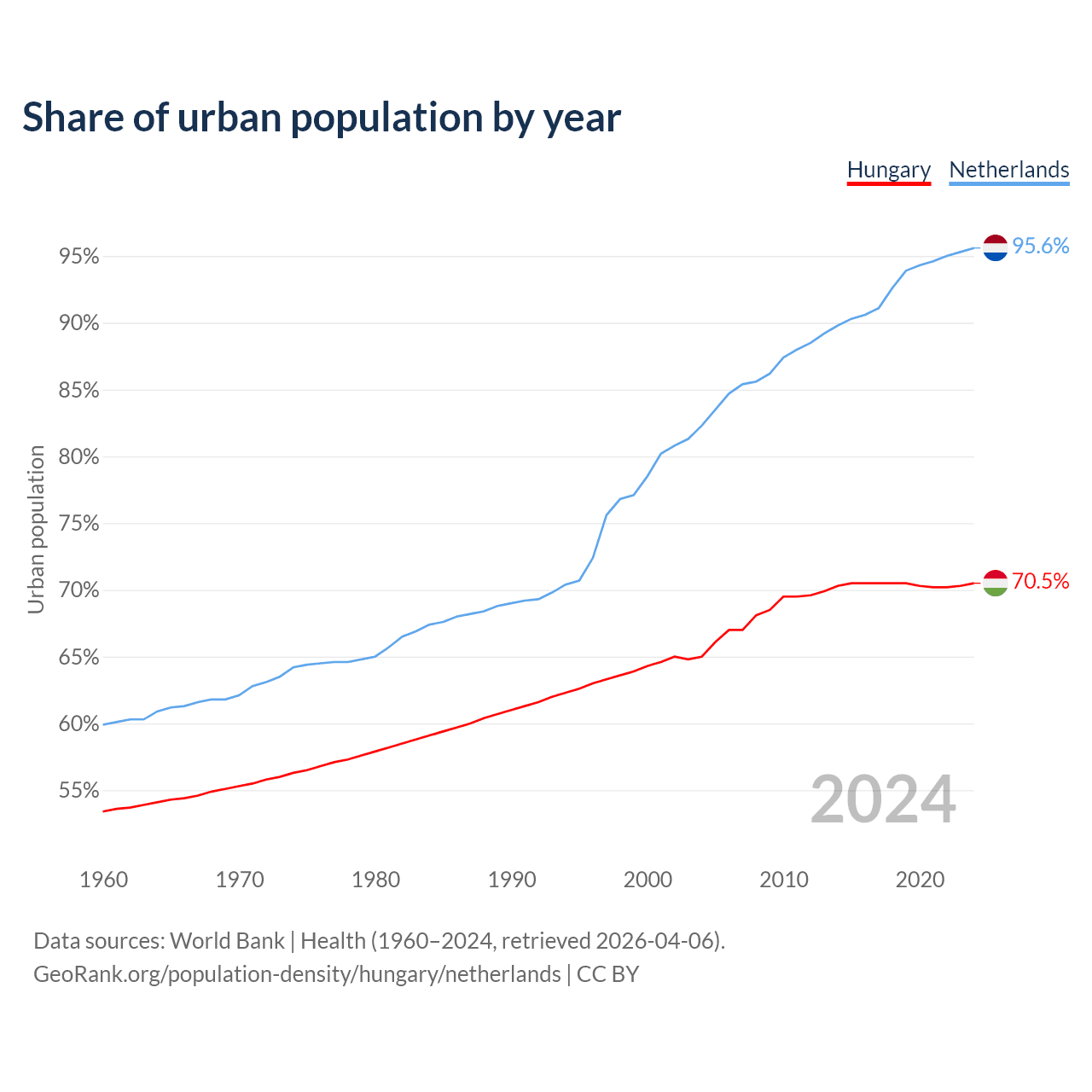 From 2004 to 2024, the share of urban population changed from 65% to 70.5% in Hungary and from 82.3% to 95.6% in the Netherlands.