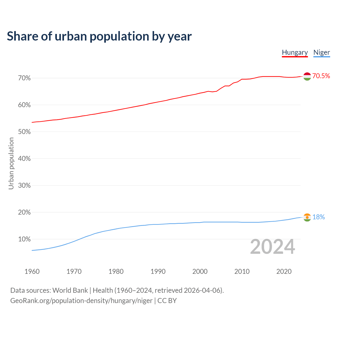 From 2004 to 2024, the share of urban population changed from 65% to 70.5% in Hungary and from 16.3% to 18% in Niger.