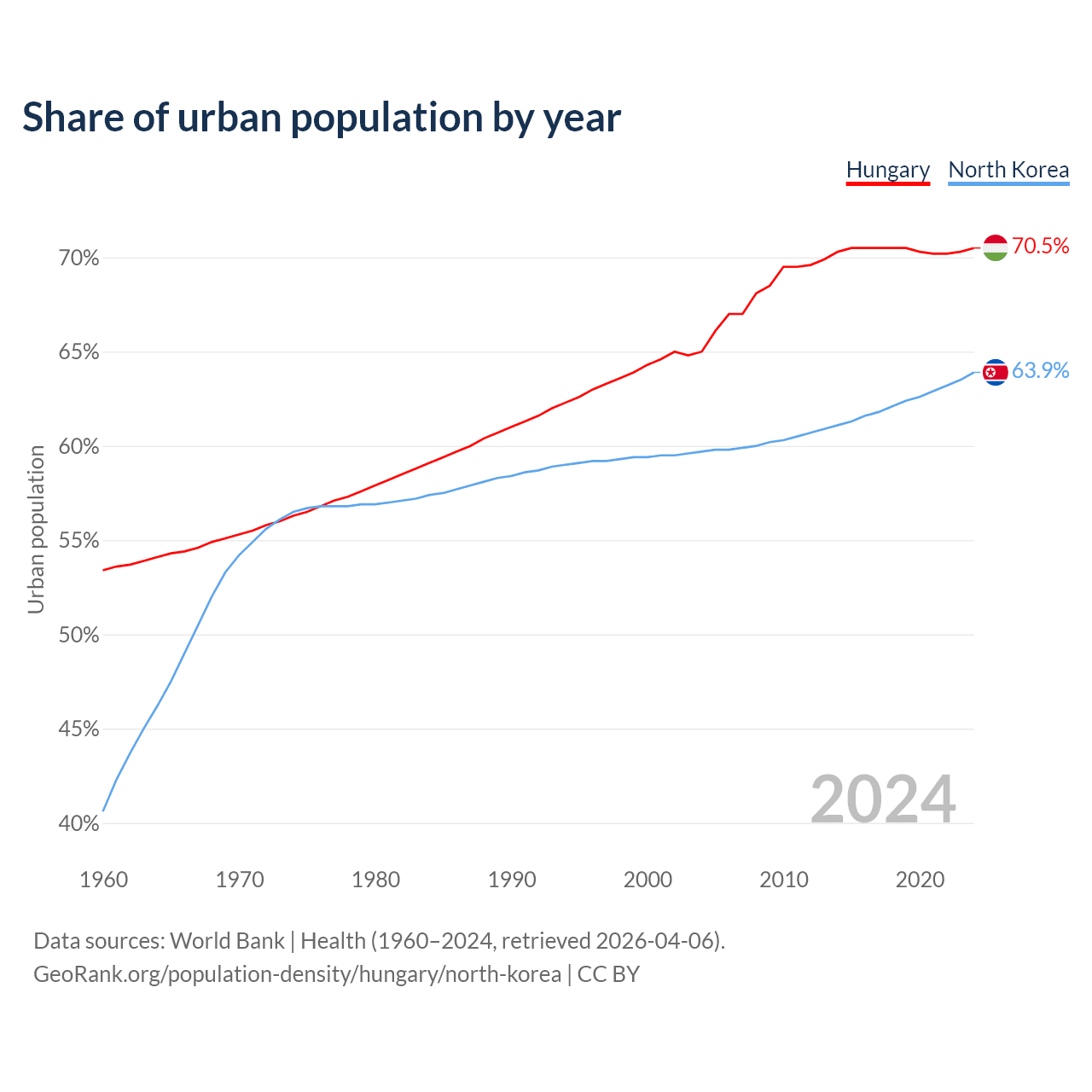 From 2004 to 2024, the share of urban population changed from 65% to 70.5% in Hungary and from 59.7% to 63.9% in North Korea.
