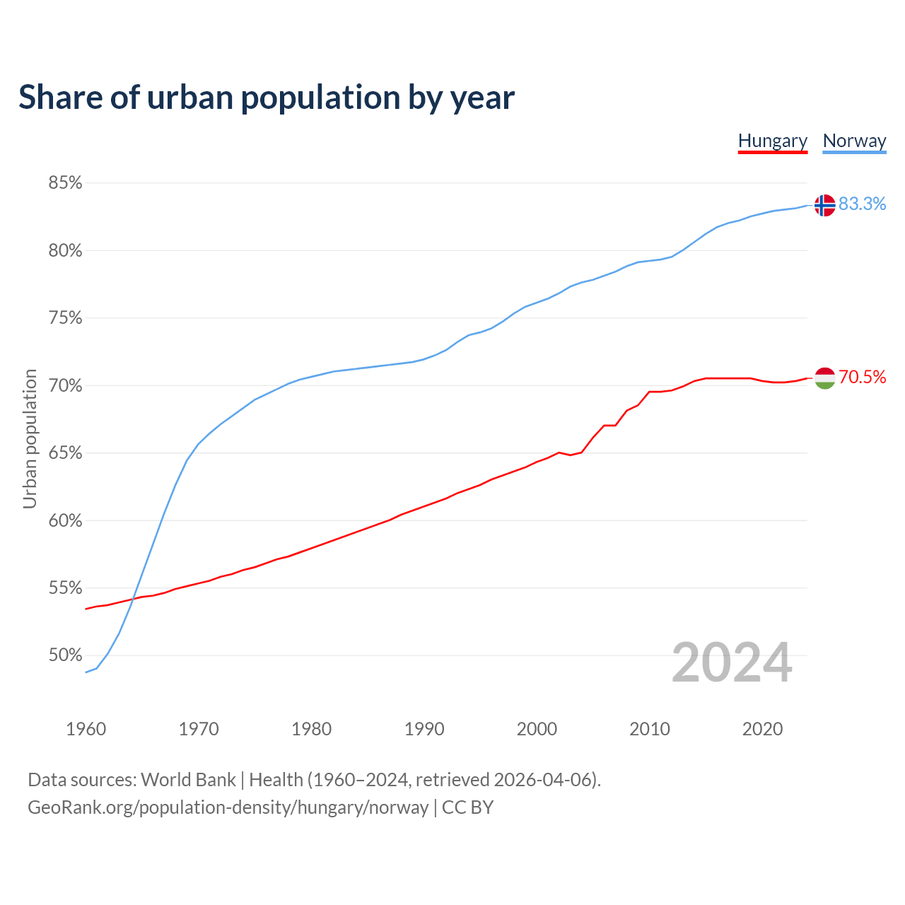 From 2004 to 2024, the share of urban population changed from 65% to 70.5% in Hungary and from 77.6% to 83.3% in Norway.