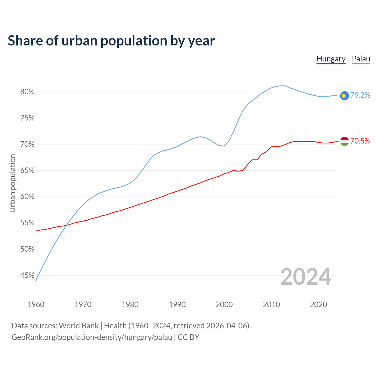 From 2004 to 2024, the share of urban population changed from 65% to 70.5% in Hungary and from 76.4% to 79.2% in Palau.