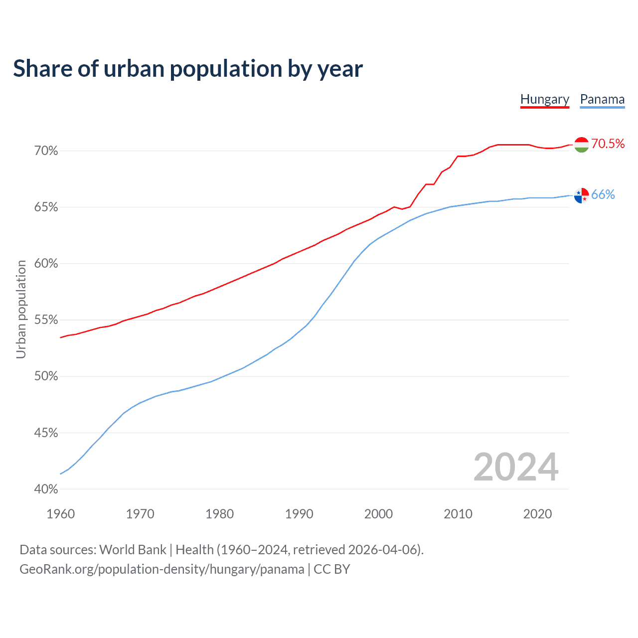From 2004 to 2024, the share of urban population changed from 65% to 70.5% in Hungary and from 63.8% to 66% in Panama.