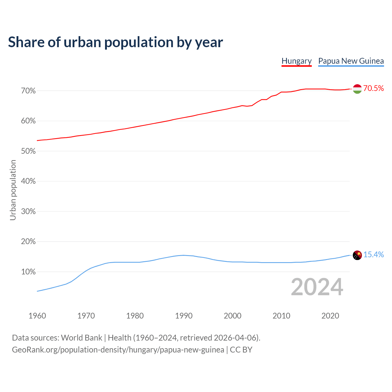 From 2004 to 2024, the share of urban population changed from 65% to 70.5% in Hungary and from 13.1% to 15.4% in Papua New Guinea.