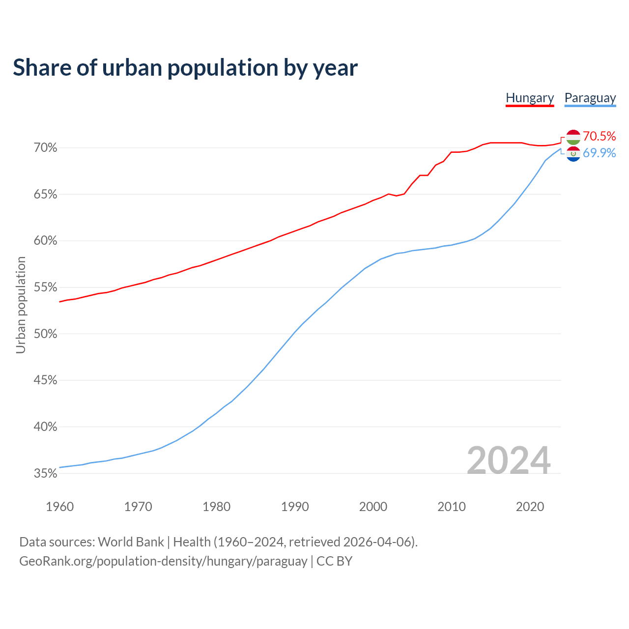 From 2004 to 2024, the share of urban population changed from 65% to 70.5% in Hungary and from 58.7% to 69.9% in Paraguay.