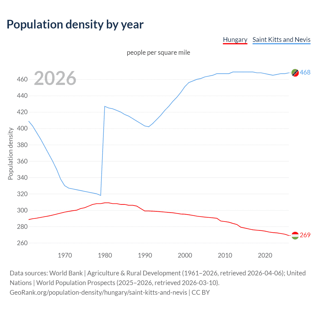 From 2006 to 2026, population density in Hungary decreased by 7.62%, compared to a 0.93% growth in Saint Kitts and Nevis.