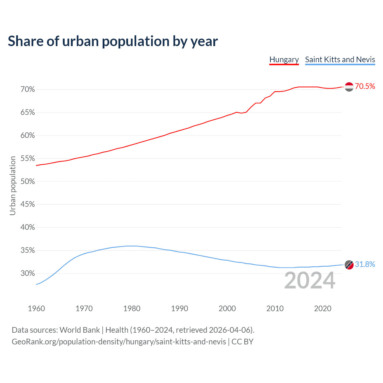 From 2004 to 2024, the share of urban population changed from 65% to 70.5% in Hungary and from 32.1% to 31.8% in Saint Kitts and Nevis.