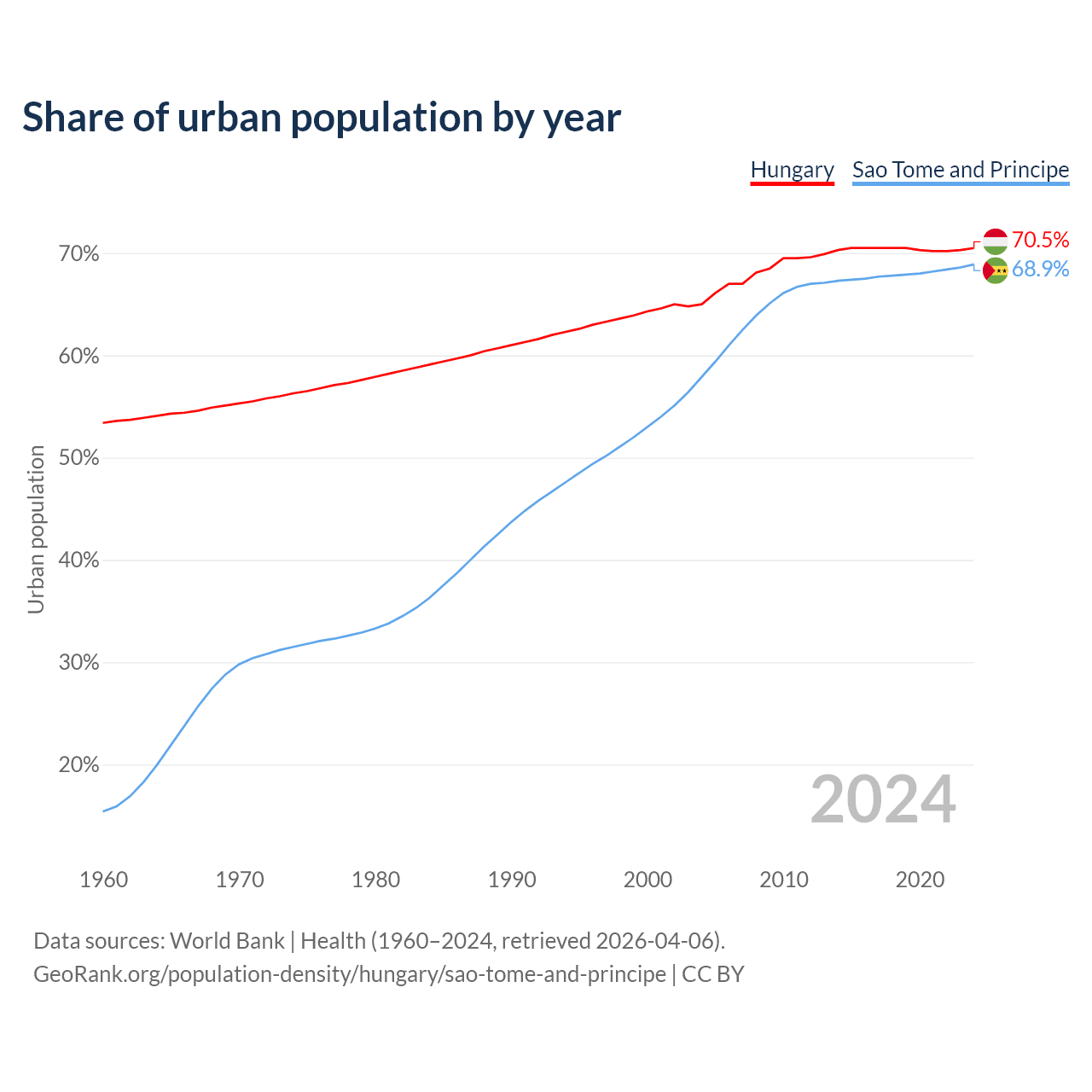 From 2004 to 2024, the share of urban population changed from 65% to 70.5% in Hungary and from 57.9% to 68.9% in Sao Tome and Principe.