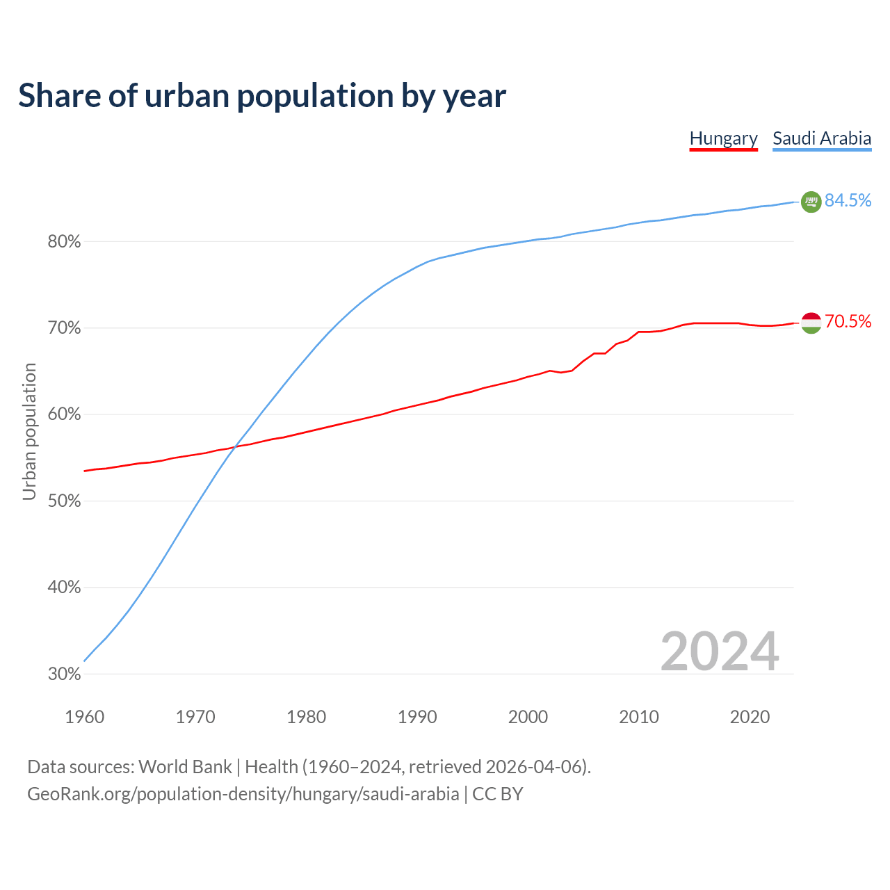 From 2004 to 2024, the share of urban population changed from 65% to 70.5% in Hungary and from 80.8% to 84.5% in Saudi Arabia.