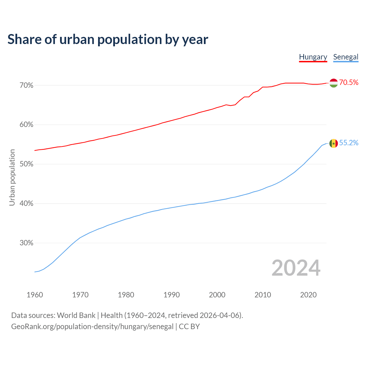 From 2004 to 2024, the share of urban population changed from 65% to 70.5% in Hungary and from 41.6% to 55.2% in Senegal.