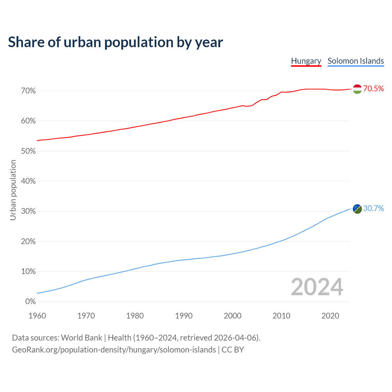 From 2004 to 2024, the share of urban population changed from 65% to 70.5% in Hungary and from 17.2% to 30.7% in the Solomon Islands.