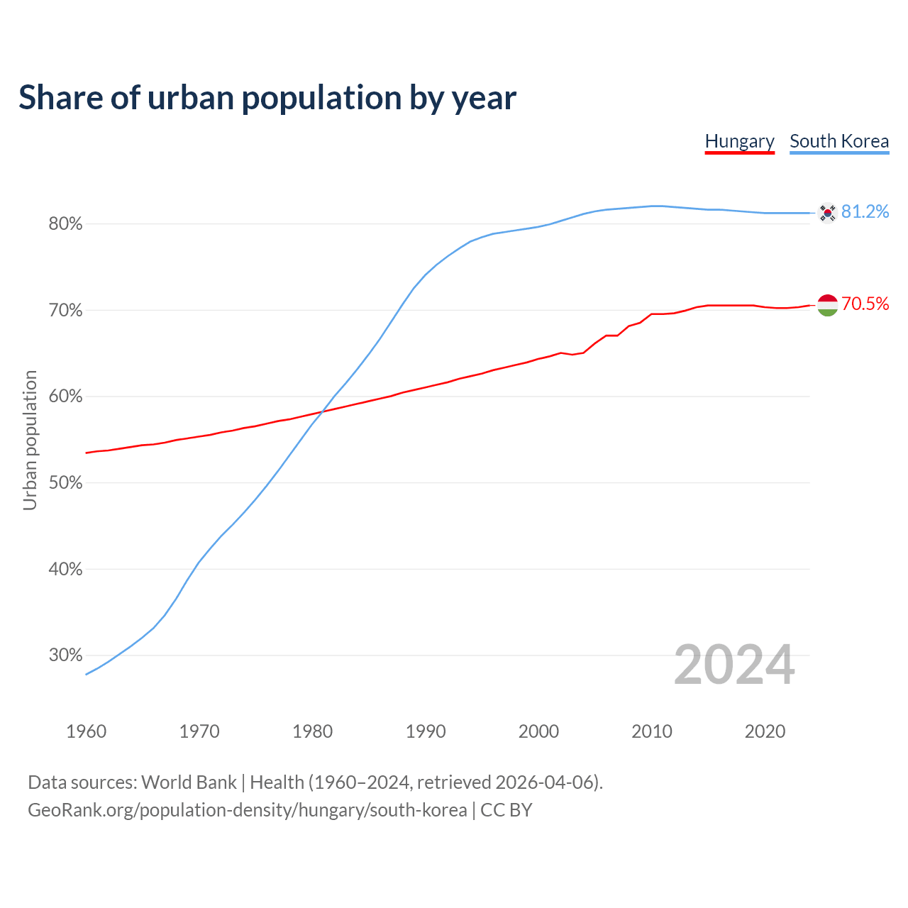 From 2004 to 2024, the share of urban population changed from 65% to 70.5% in Hungary and from 81.1% to 81.2% in South Korea.