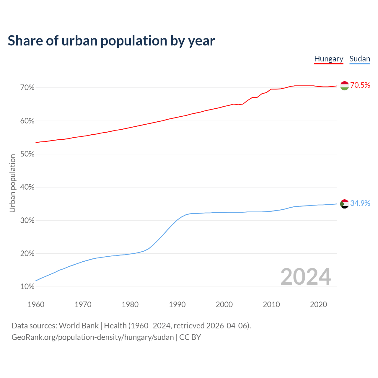 From 2004 to 2024, the share of urban population changed from 65% to 70.5% in Hungary and from 32.4% to 34.9% in Sudan.