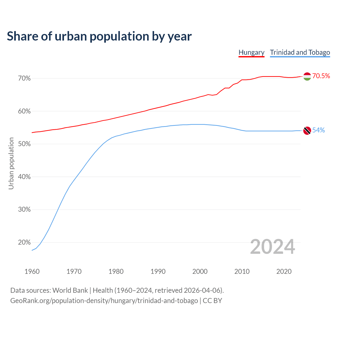 From 2004 to 2024, the share of urban population changed from 65% to 70.5% in Hungary and from 55.6% to 54% in Trinidad and Tobago.