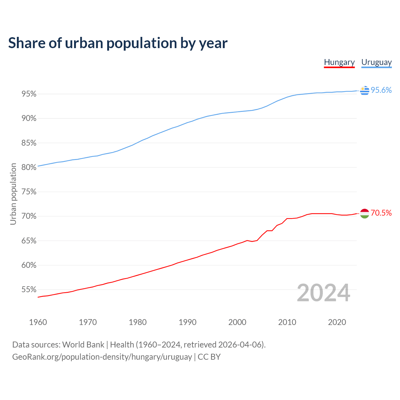 From 2004 to 2024, the share of urban population changed from 65% to 70.5% in Hungary and from 91.8% to 95.6% in Uruguay.