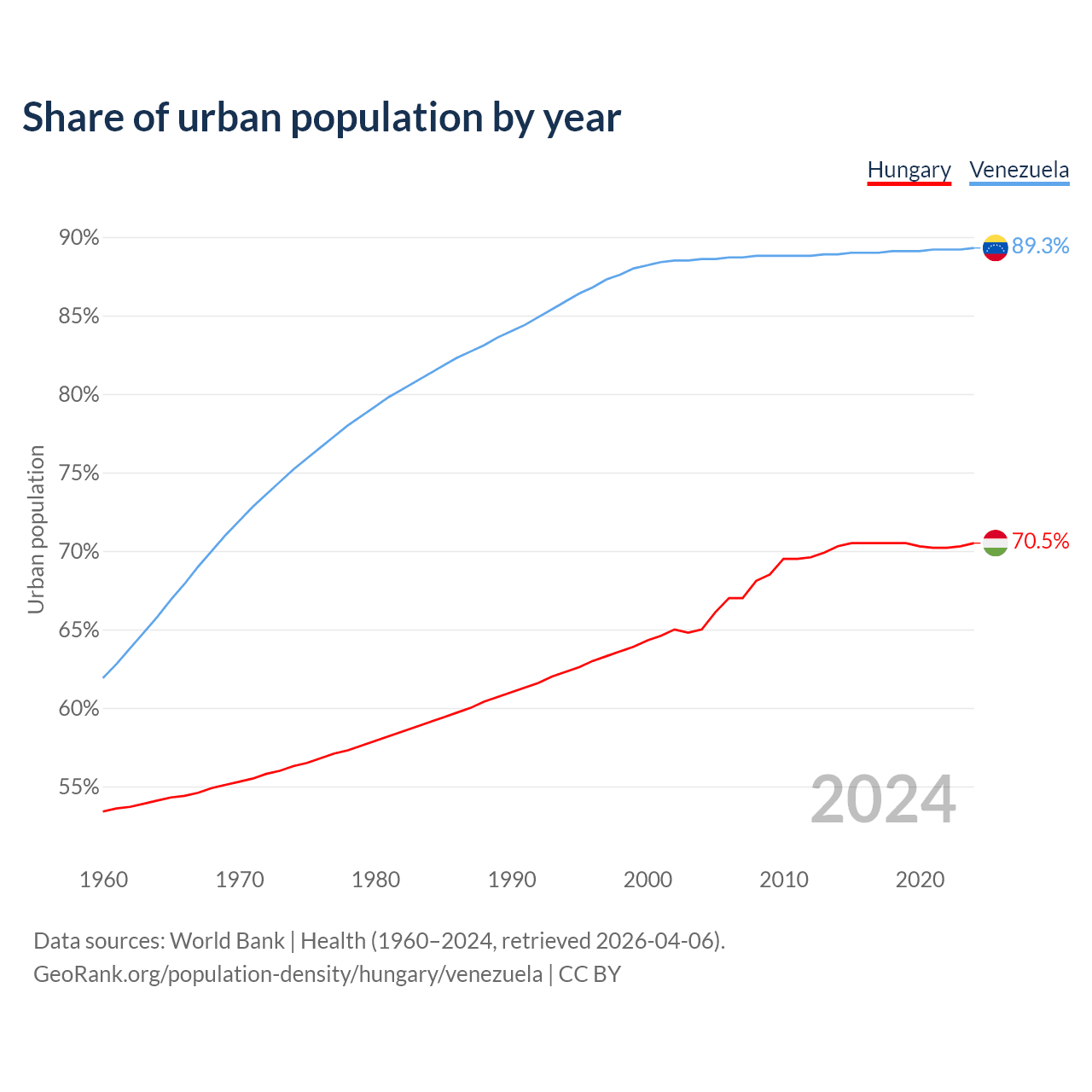 From 2004 to 2024, the share of urban population changed from 65% to 70.5% in Hungary and from 88.6% to 89.3% in Venezuela.