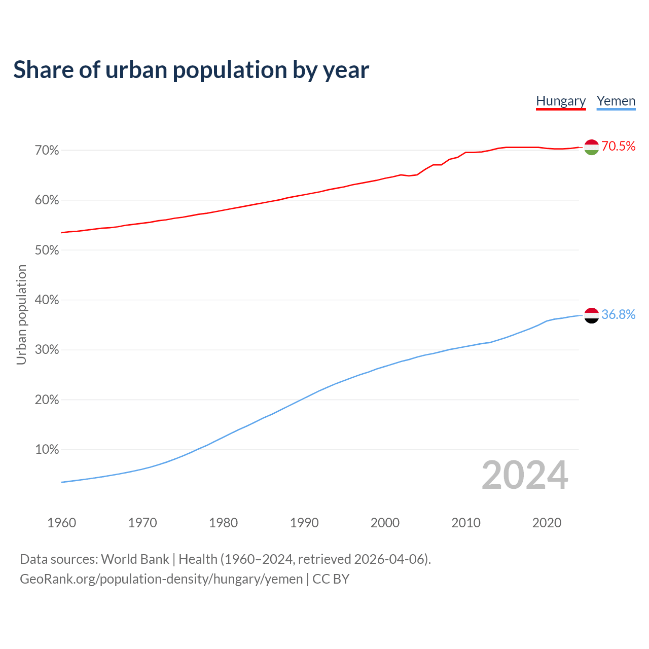 From 2004 to 2024, the share of urban population changed from 65% to 70.5% in Hungary and from 28.5% to 36.8% in Yemen.