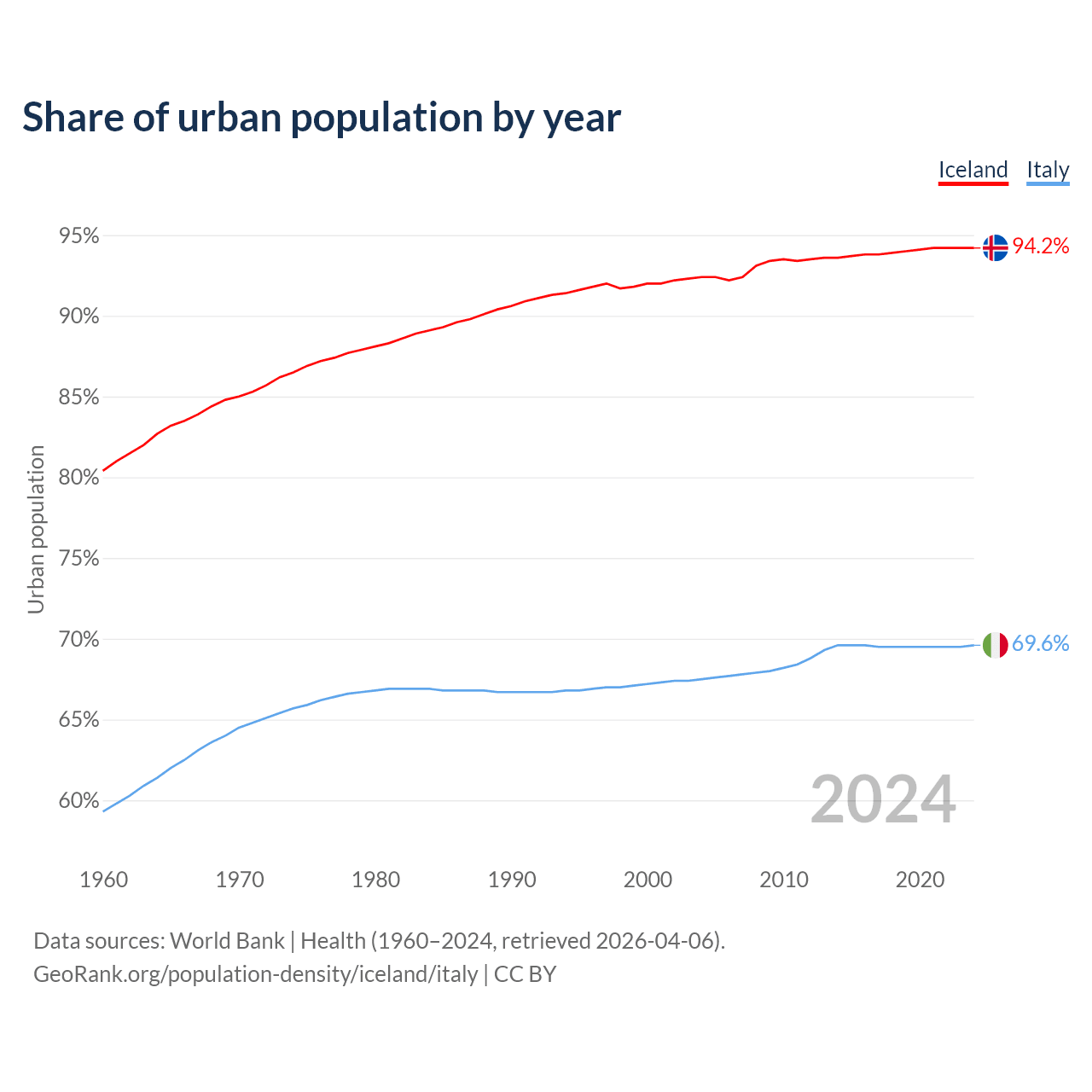From 2004 to 2024, the share of urban population changed from 92.4% to 94.2% in Iceland and from 67.5% to 69.6% in Italy.