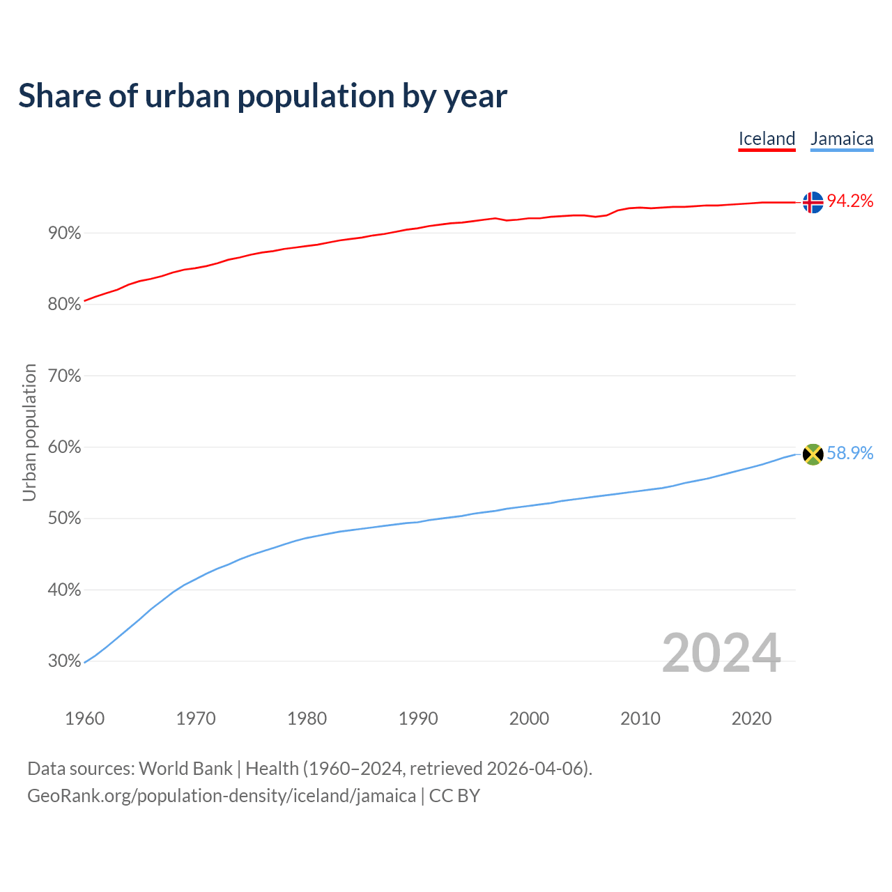 From 2004 to 2024, the share of urban population changed from 92.4% to 94.2% in Iceland and from 52.6% to 58.9% in Jamaica.