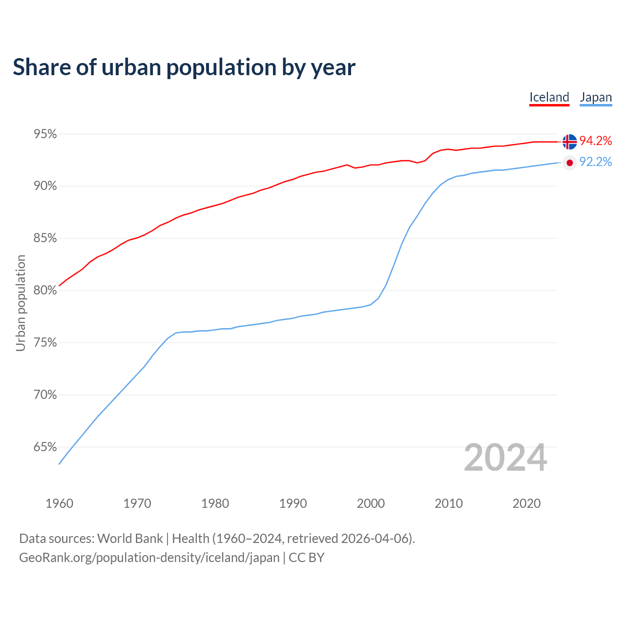 From 2004 to 2024, the share of urban population changed from 92.4% to 94.2% in Iceland and from 84.4% to 92.2% in Japan.