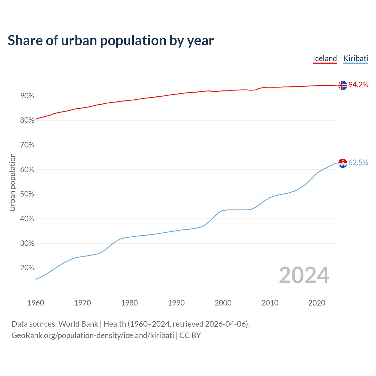 From 2004 to 2024, the share of urban population changed from 92.4% to 94.2% in Iceland and from 43.5% to 62.5% in Kiribati.