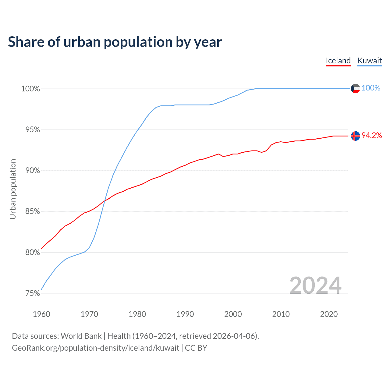 From 2004 to 2024, the share of urban population changed from 92.4% to 94.2% in Iceland and from 99.9% to 100% in Kuwait.