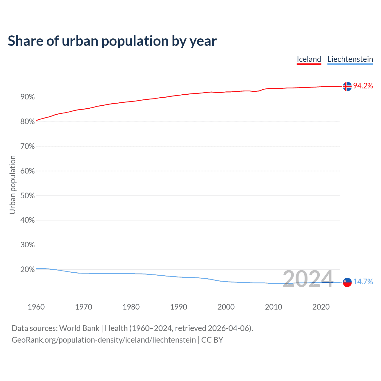 From 2004 to 2024, the share of urban population changed from 92.4% to 94.2% in Iceland and from 14.7% to 14.7% in Liechtenstein.