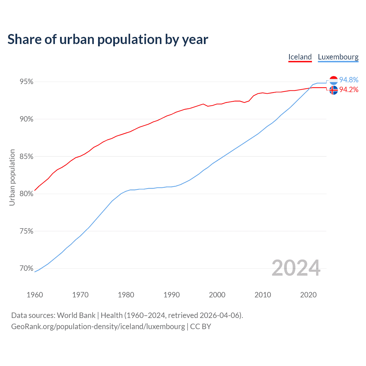 From 2004 to 2024, the share of urban population changed from 92.4% to 94.2% in Iceland and from 86% to 94.8% in Luxembourg.