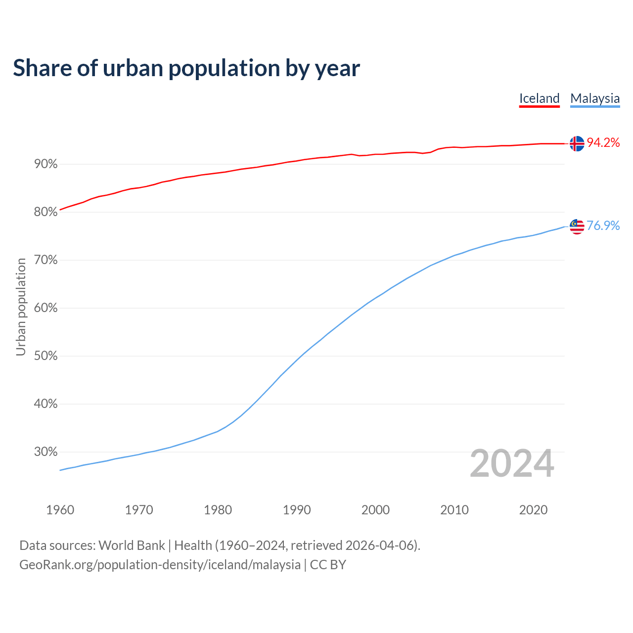 From 2004 to 2024, the share of urban population changed from 92.4% to 94.2% in Iceland and from 66.1% to 76.9% in Malaysia.