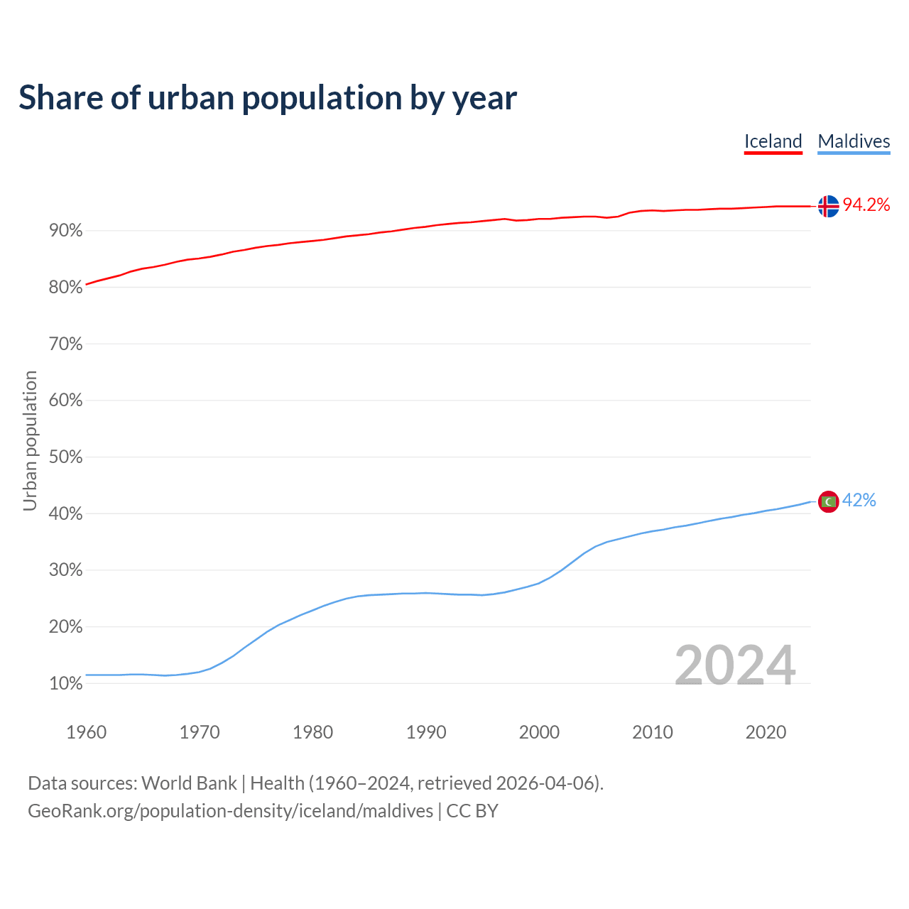 From 2004 to 2024, the share of urban population changed from 92.4% to 94.2% in Iceland and from 32.9% to 42% in Maldives.