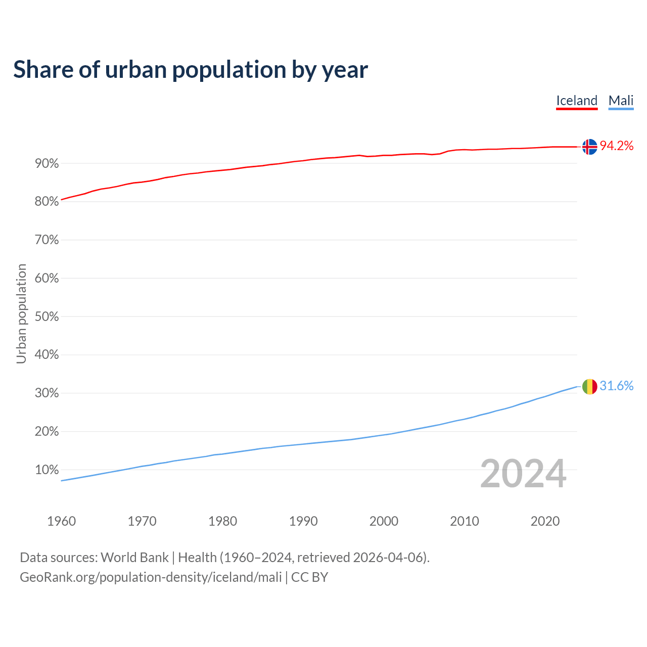 From 2004 to 2024, the share of urban population changed from 92.4% to 94.2% in Iceland and from 20.5% to 31.6% in Mali.