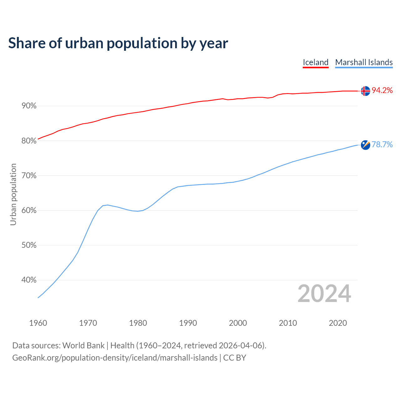 From 2004 to 2024, the share of urban population changed from 92.4% to 94.2% in Iceland and from 70.1% to 78.7% in the Marshall Islands.