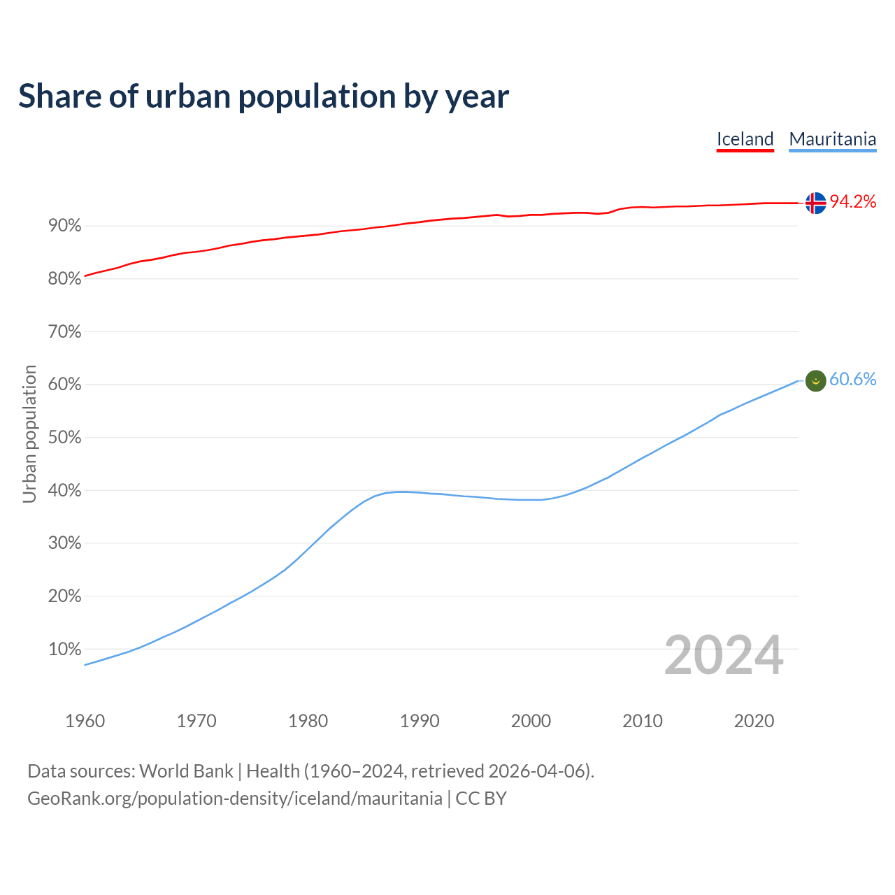 From 2004 to 2024, the share of urban population changed from 92.4% to 94.2% in Iceland and from 39.6% to 60.6% in Mauritania.