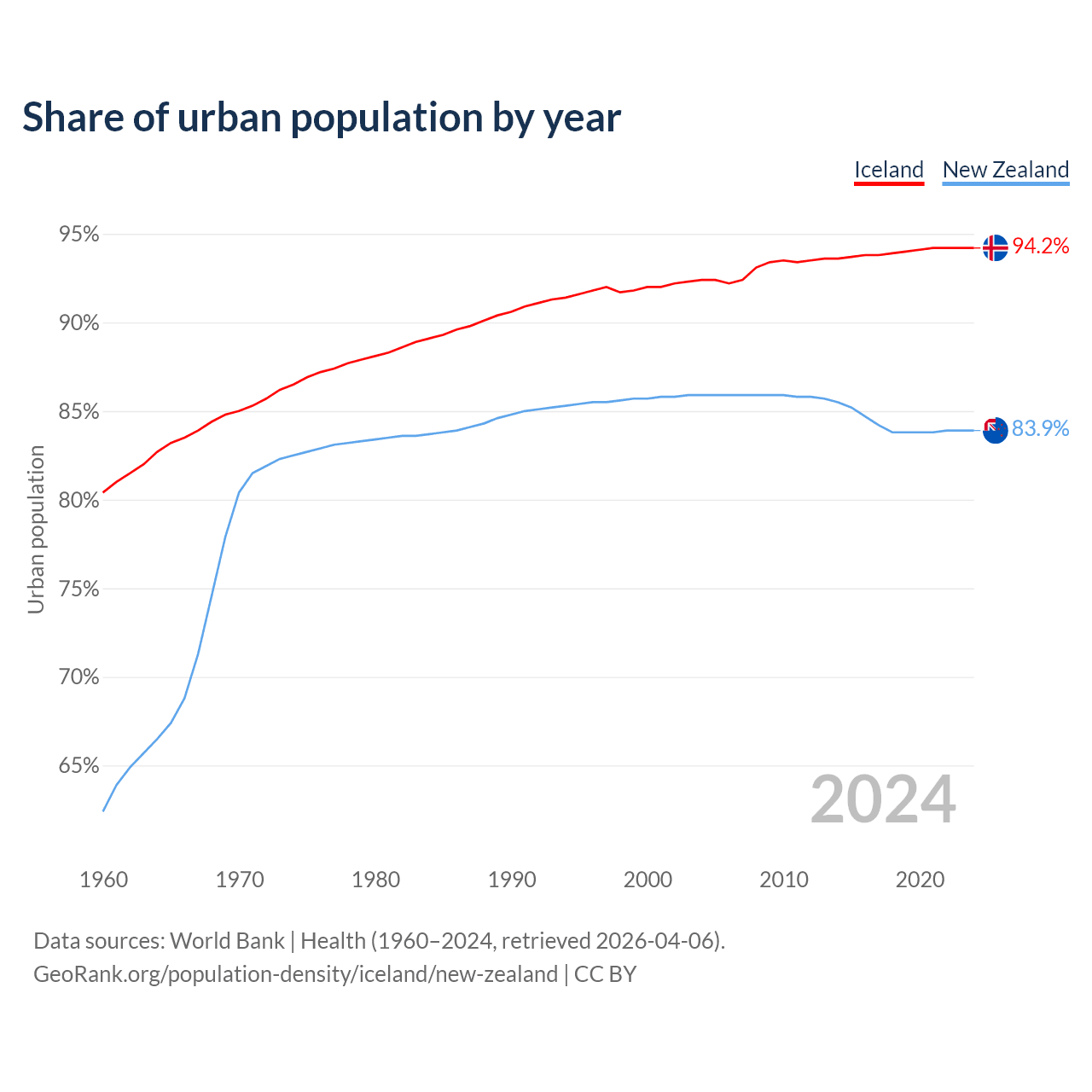 From 2004 to 2024, the share of urban population changed from 92.4% to 94.2% in Iceland and from 85.9% to 83.9% in New Zealand.