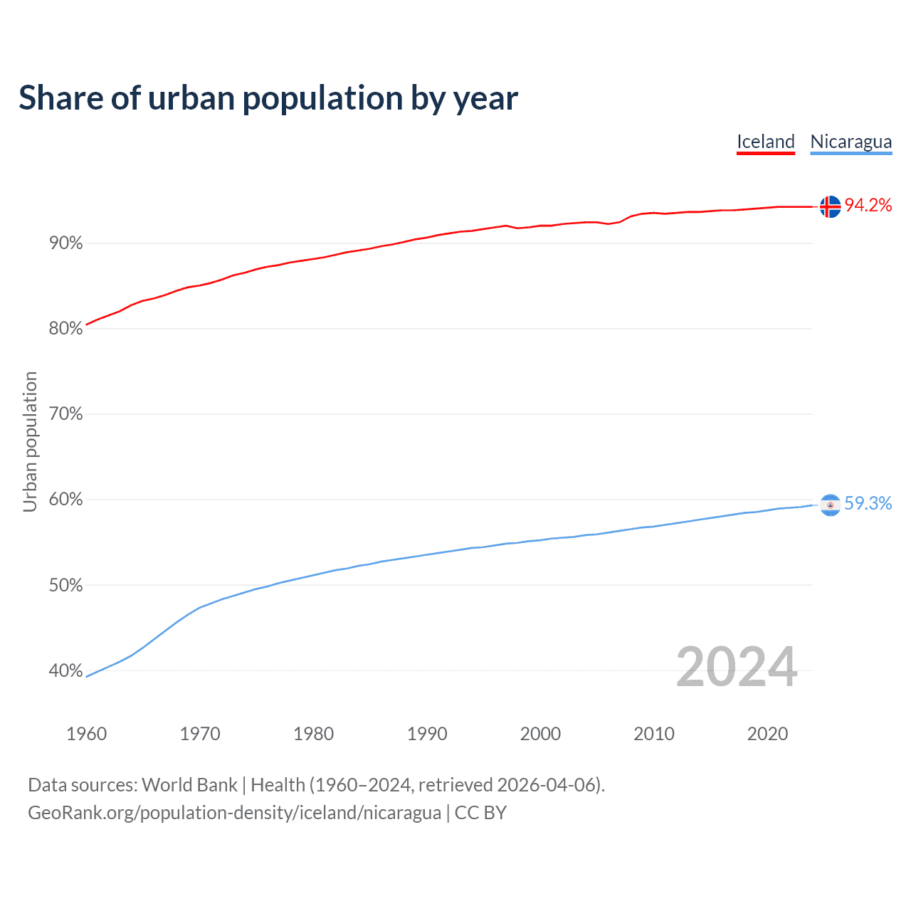 From 2004 to 2024, the share of urban population changed from 92.4% to 94.2% in Iceland and from 55.8% to 59.3% in Nicaragua.