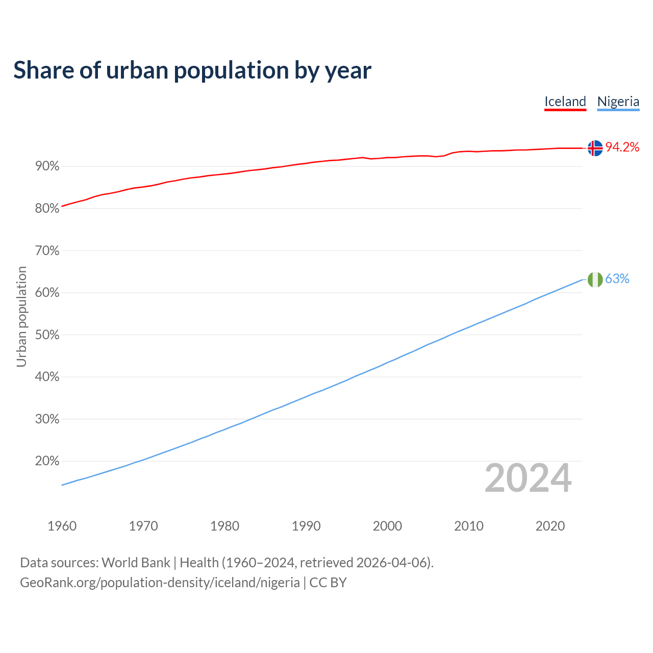 From 2004 to 2024, the share of urban population changed from 92.4% to 94.2% in Iceland and from 46.7% to 63% in Nigeria.