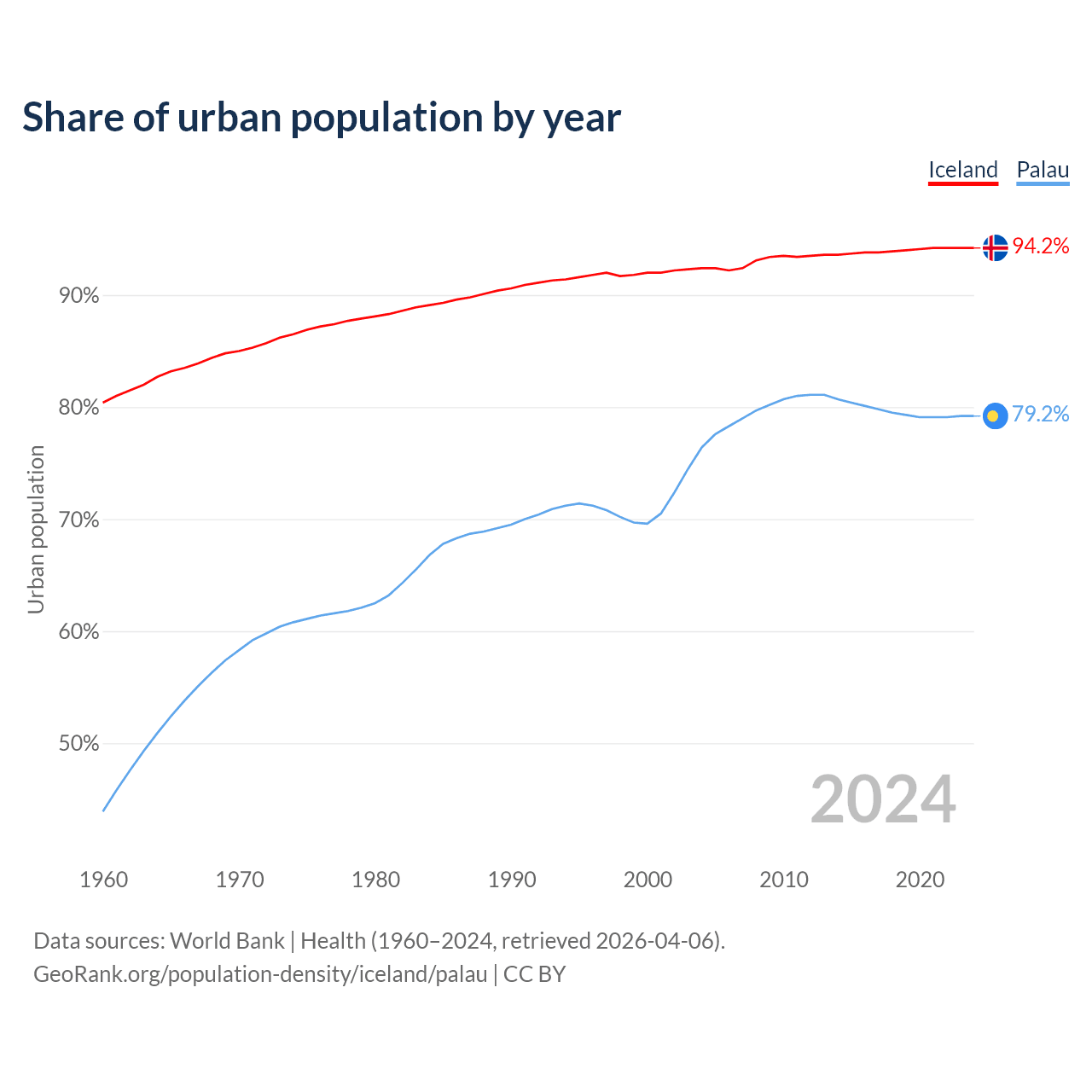 From 2004 to 2024, the share of urban population changed from 92.4% to 94.2% in Iceland and from 76.4% to 79.2% in Palau.