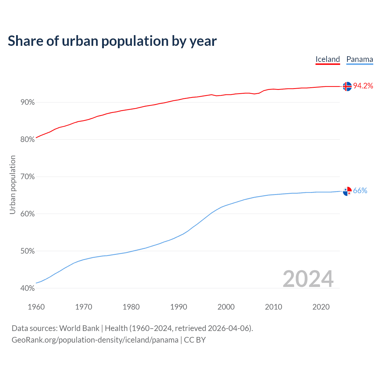 From 2004 to 2024, the share of urban population changed from 92.4% to 94.2% in Iceland and from 63.8% to 66% in Panama.