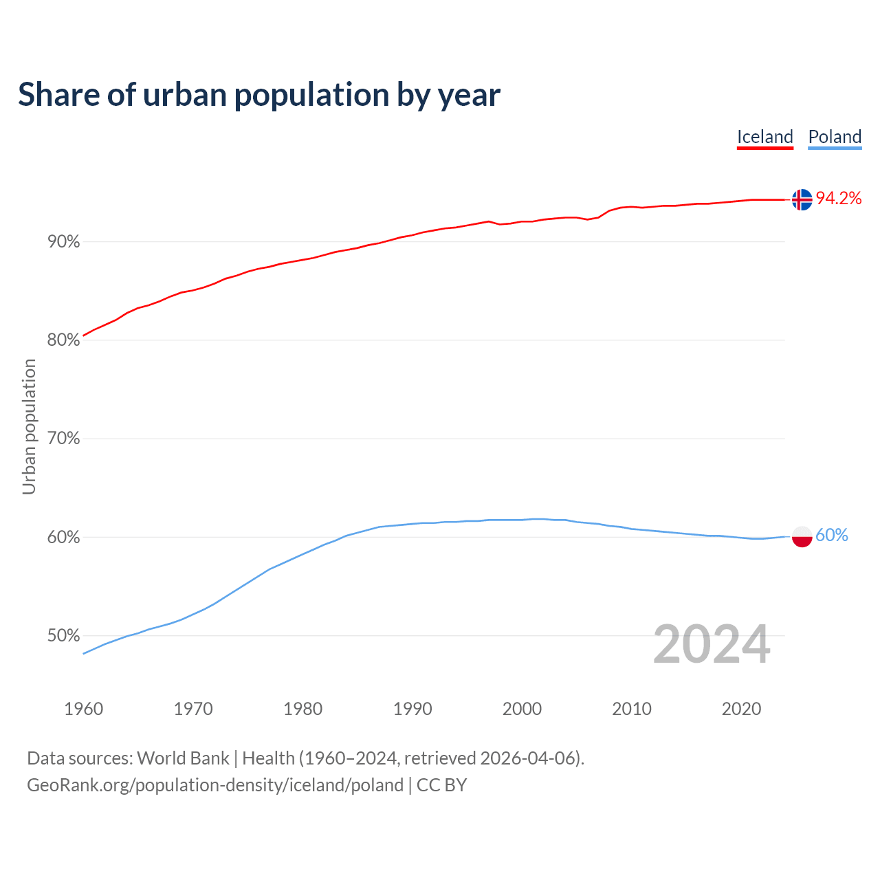 From 2004 to 2024, the share of urban population changed from 92.4% to 94.2% in Iceland and from 61.7% to 60% in Poland.