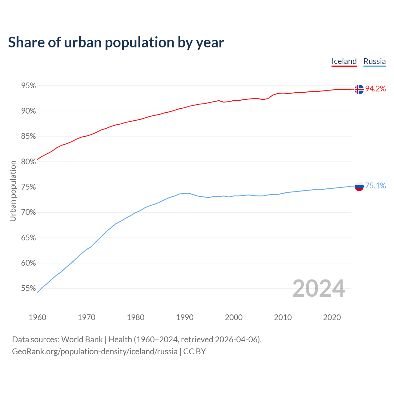 From 2004 to 2024, the share of urban population changed from 92.4% to 94.2% in Iceland and from 73.3% to 75.1% in Russia.
