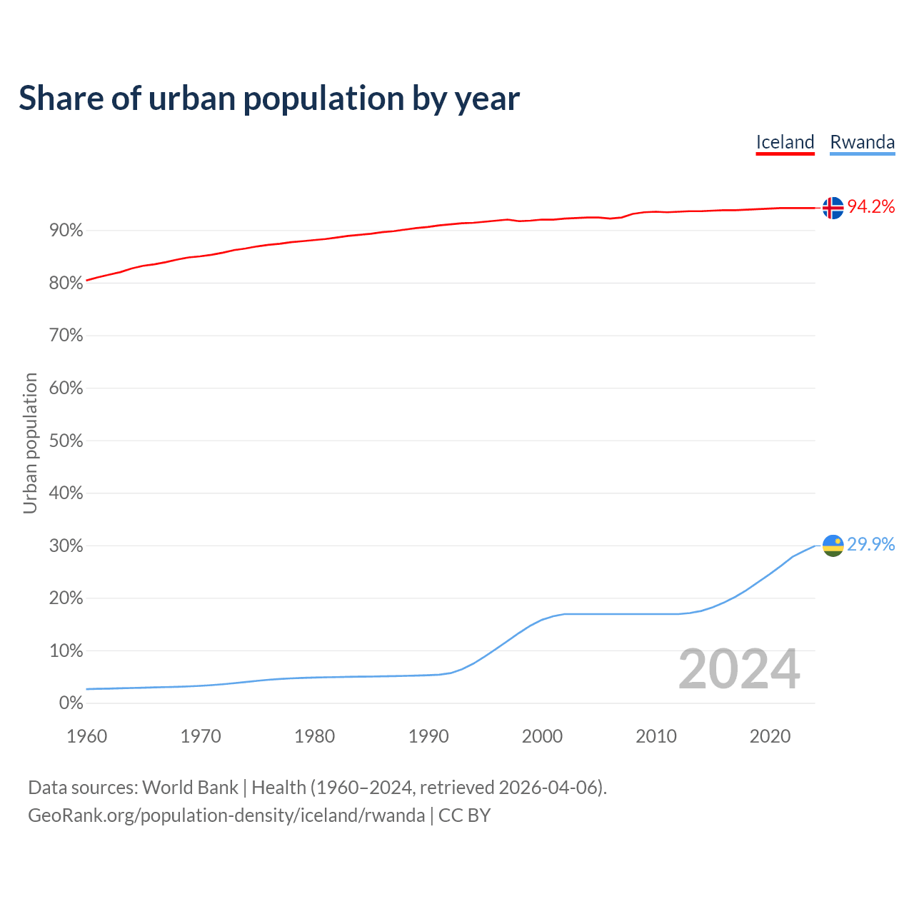 From 2004 to 2024, the share of urban population changed from 92.4% to 94.2% in Iceland and from 16.9% to 29.9% in Rwanda.