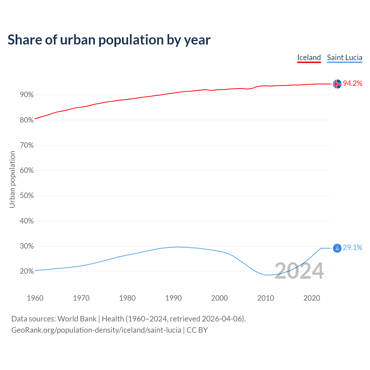 From 2004 to 2024, the share of urban population changed from 92.4% to 94.2% in Iceland and from 24.8% to 29.1% in Saint Lucia.