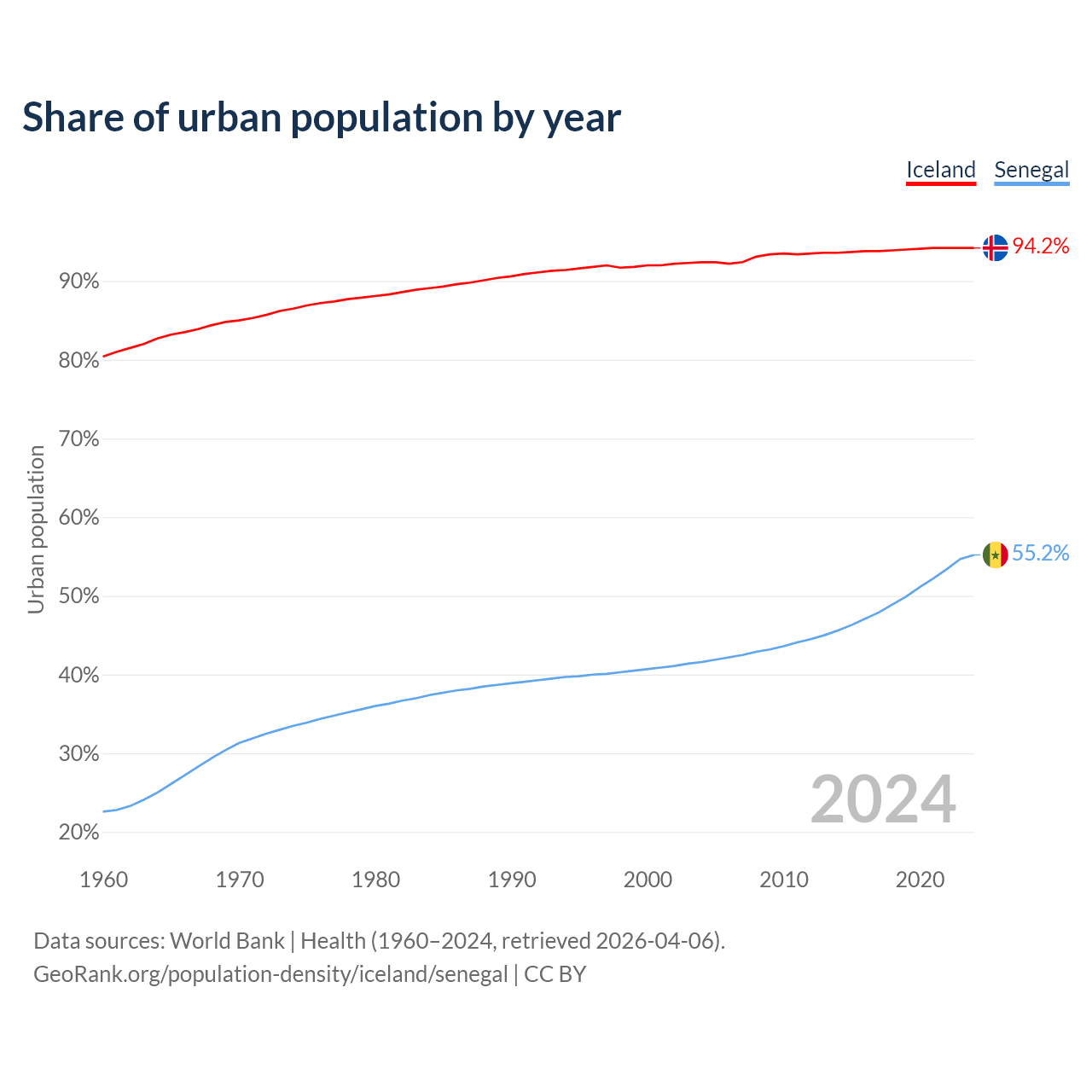 From 2004 to 2024, the share of urban population changed from 92.4% to 94.2% in Iceland and from 41.6% to 55.2% in Senegal.