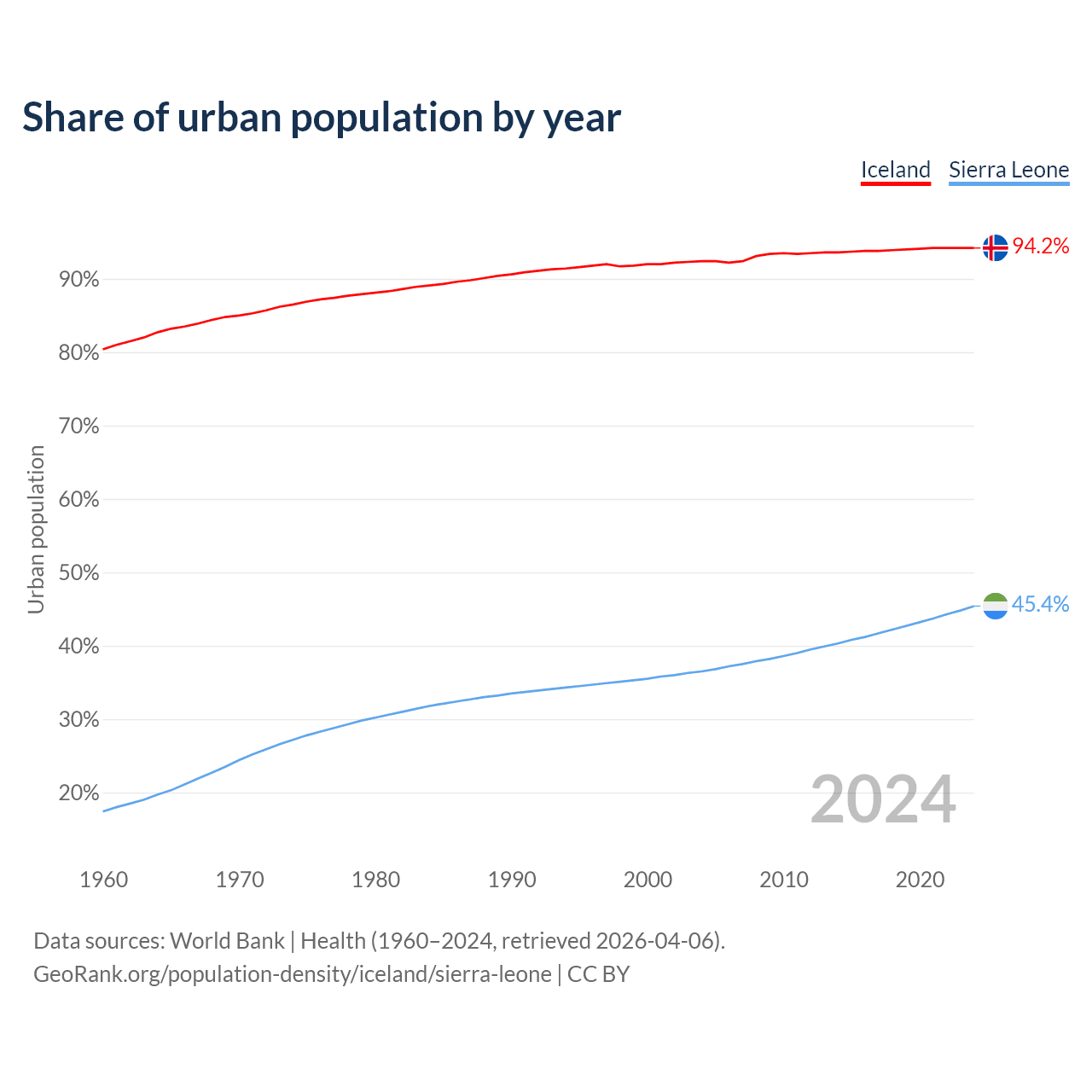 From 2004 to 2024, the share of urban population changed from 92.4% to 94.2% in Iceland and from 36.5% to 45.4% in Sierra Leone.