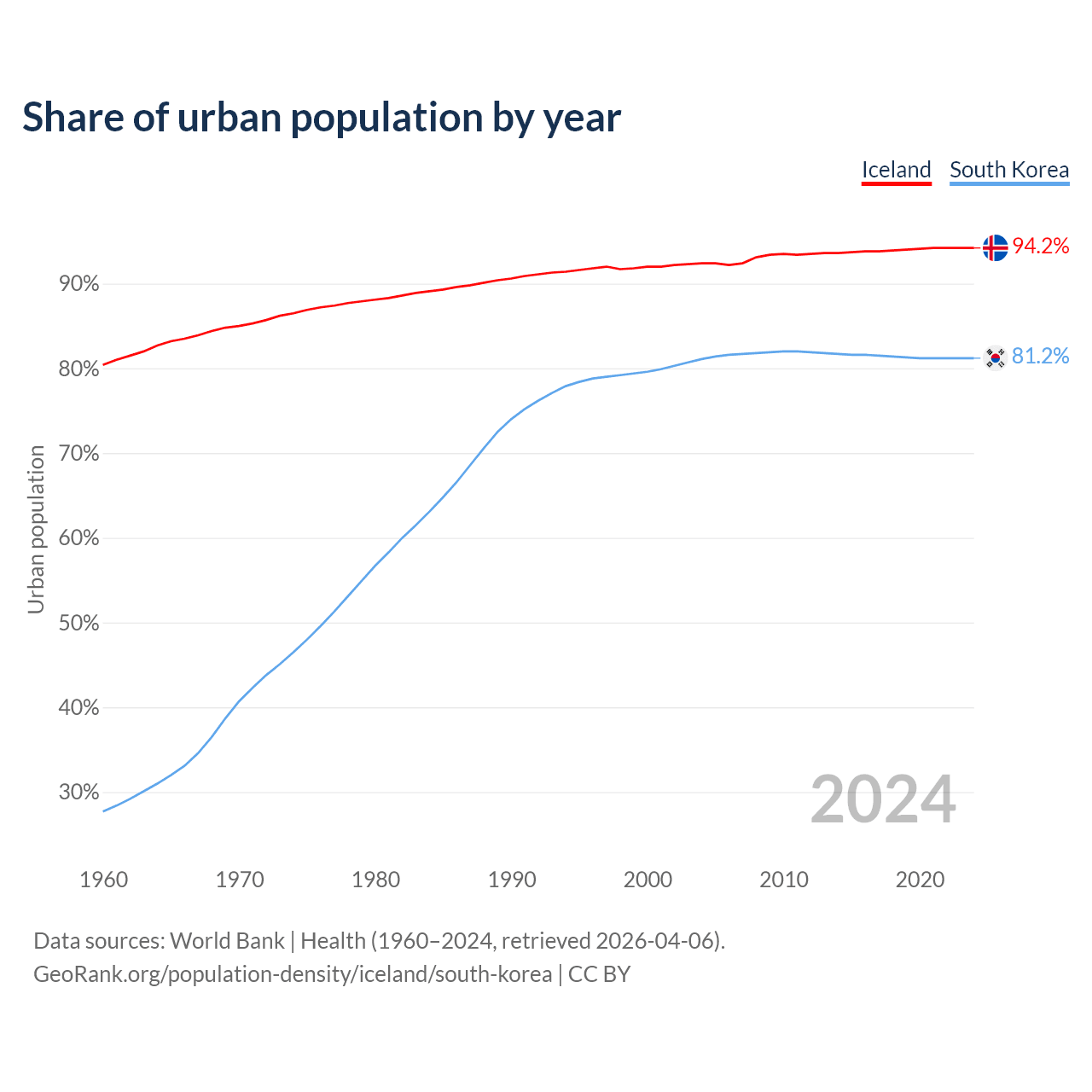 From 2004 to 2024, the share of urban population changed from 92.4% to 94.2% in Iceland and from 81.1% to 81.2% in South Korea.