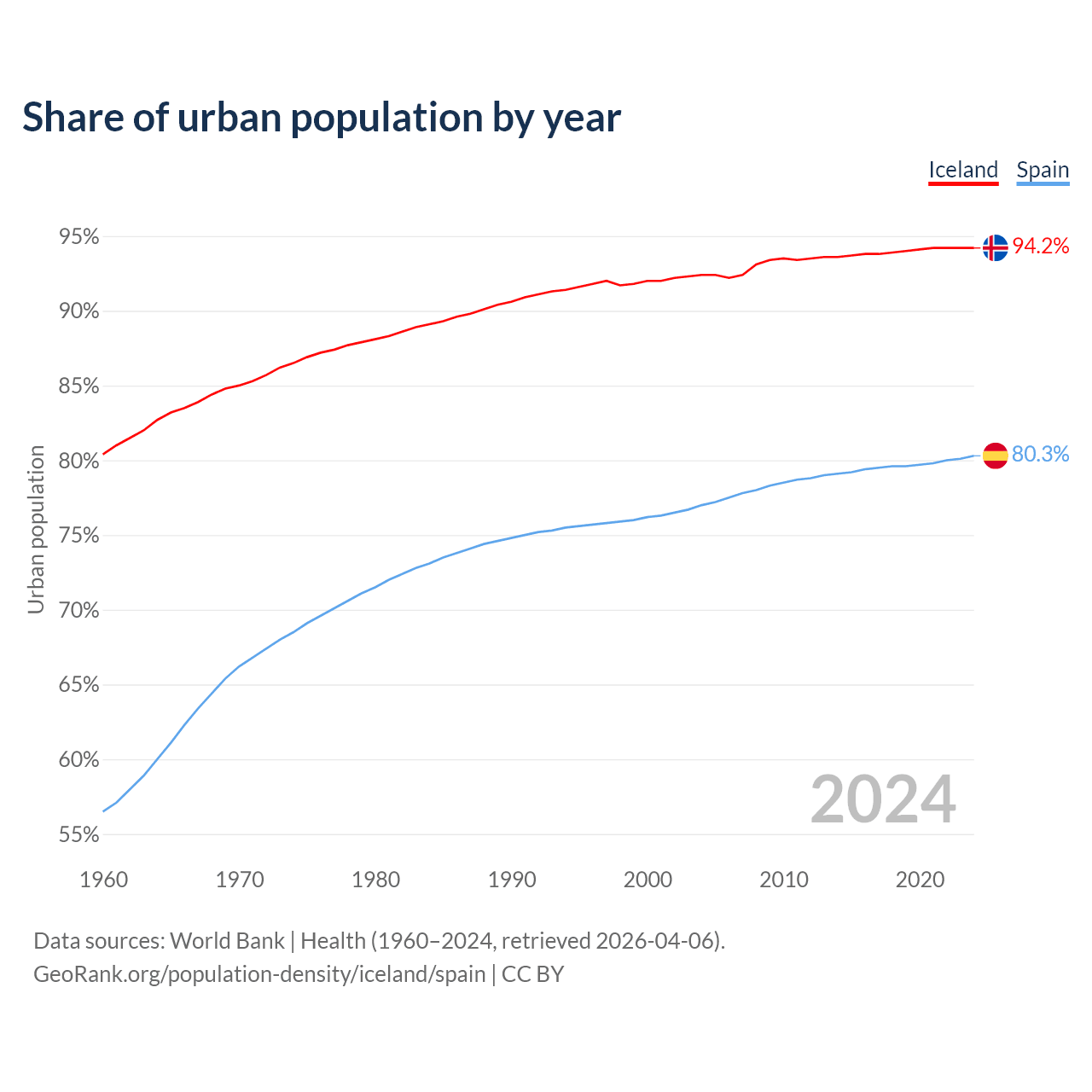 From 2004 to 2024, the share of urban population changed from 92.4% to 94.2% in Iceland and from 77% to 80.3% in Spain.