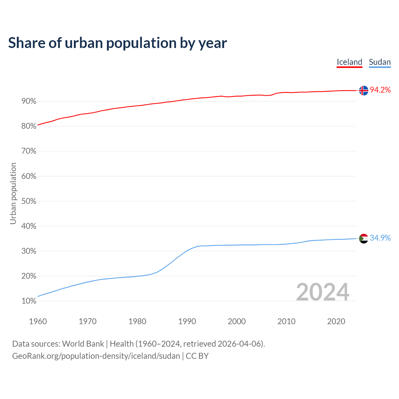 From 2004 to 2024, the share of urban population changed from 92.4% to 94.2% in Iceland and from 32.4% to 34.9% in Sudan.