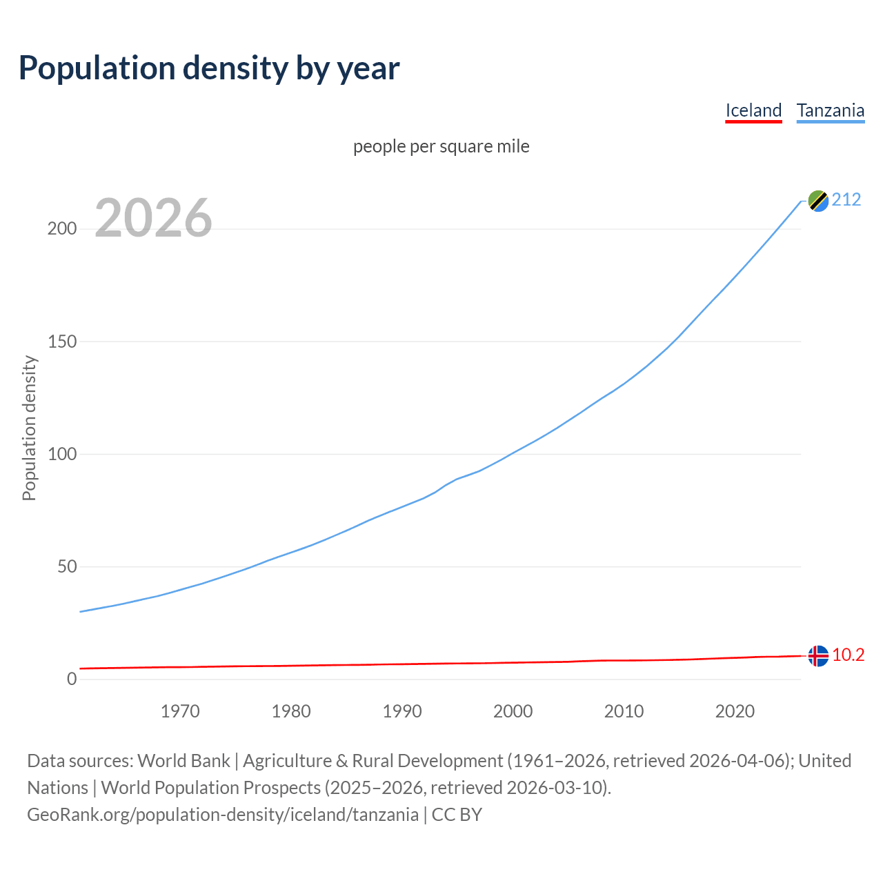 From 2006 to 2026, population density in Iceland increased by 29.7%, compared to a 80.1% growth in Tanzania.